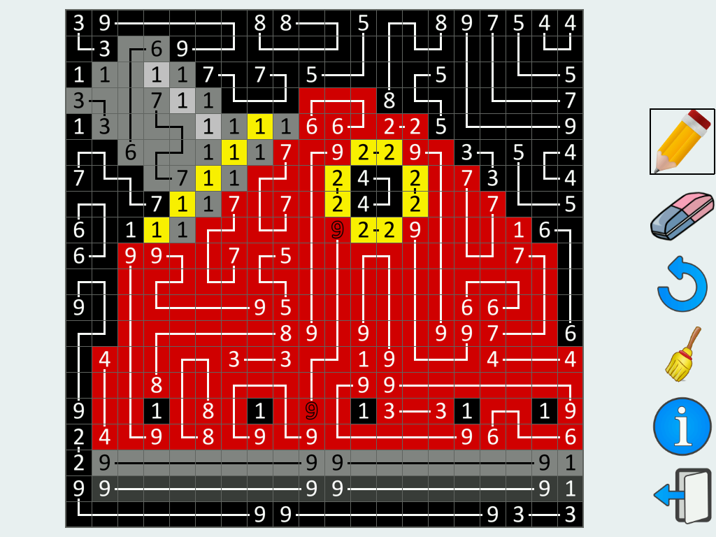 - Paths may follow horizontal or vertical directions and are not allowed to cross other paths.The couple of number cannot being joined by diagonal line. Squares containing 1 represent paths that are 1-square long. When the puzzle is finished, you can see a picture.